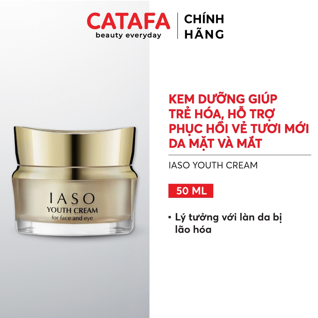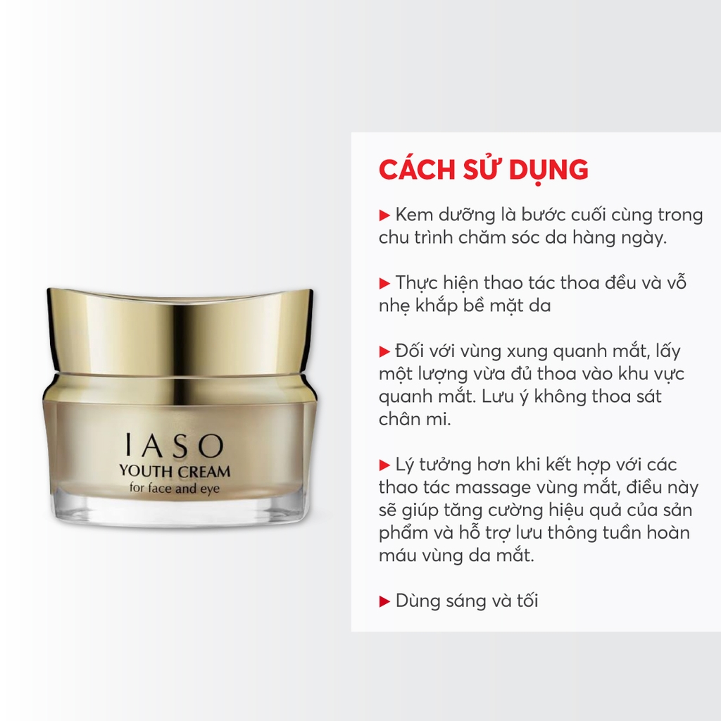 Iaso Youth Cream – Kem dưỡng trẻ hóa, phục hồi da mặt và mắt là giải pháp khóa ẩm hoàn hảo cho những làn da lão hóa thời kỳ đầu, làm giảm các dấu hiệu lão hóa như khô ráp, mờ xỉn, nếp nhăn, làn da mệt mỏi, kém độ tươi sáng, rạng rỡ. Iaso Youth Cream giúp tái tạo da, giúp trẻ hóa da, cho làn da trắng sáng, căng mịn, nâng cơ, săn chắc da và làm chậm lại tiến trình lão hóa da