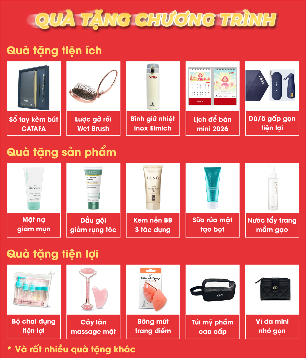 Catafa dành nhiều phần quà thiết thực và ý nghĩa như mỹ phẩm chăm sóc da, sản phẩm chăm sóc sức khỏe, phụ kiện làm đẹp và voucher ưu đãi hấp dẫn, thay cho lời cảm ơn đến những khách hàng đã dành thời gian quý báu góp ý cho Catafa.