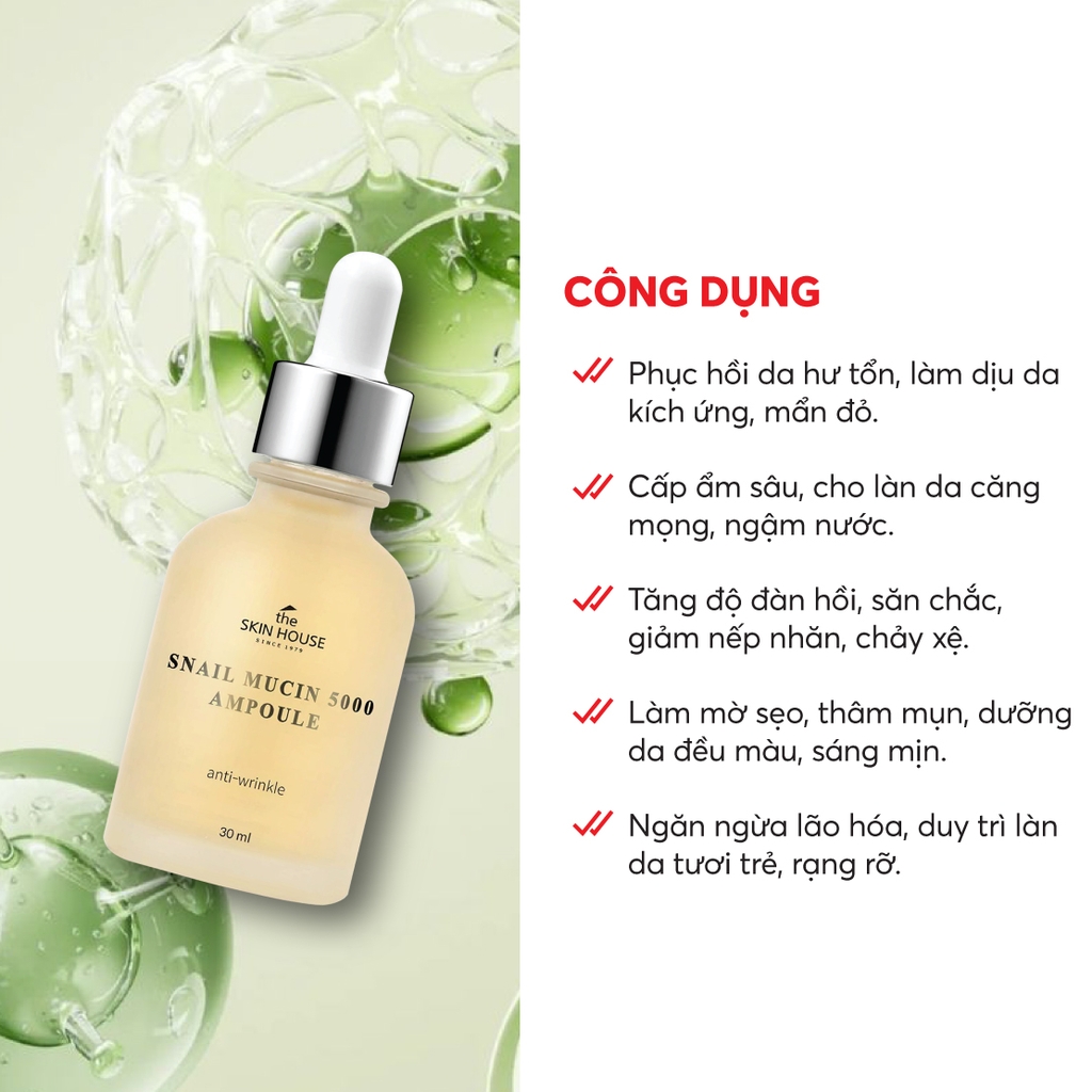 Công dụng: Huyết thanh giúp ngăn ngừa và cải thiện nếp nhăn hiệu quả, cho làn da săn chắc, đàn hội rõ rệt, nhờ chứa thành phần chiết xuất dịch nhầy ốc sên, được kết hợp cùng Hyaluronic Acid và Adenosine. Nếp nhăn được làm đầy và cải thiện đáng kể, đem đến làn da tươi trẻ. Phù hợp với mọi loại da, đặc biệt lý tưởng với da xuất hiện nhiều nếp nhăn, chảy xệ.